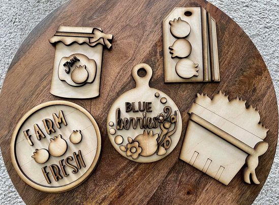 The 3D Blueberry Tiered Tray includes 5 pieces (Blueberry jam, Blueberry tag, container of blueberries, farm fresh blueberries, blueberry with flower sign)