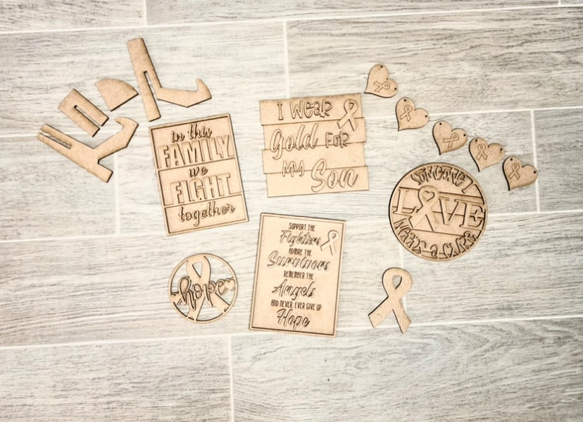 The 3D Cancer Awareness Tiered Tray includes 7 pieces (In this family we fight together sign, Hope with ribbon round I wear Gold for my Son (The word gold and son can be changed to anything you want), Support the fighter tag, Awareness ribbon on hearts banner, awareness ribbon decor and Someone I love needs a cure round)