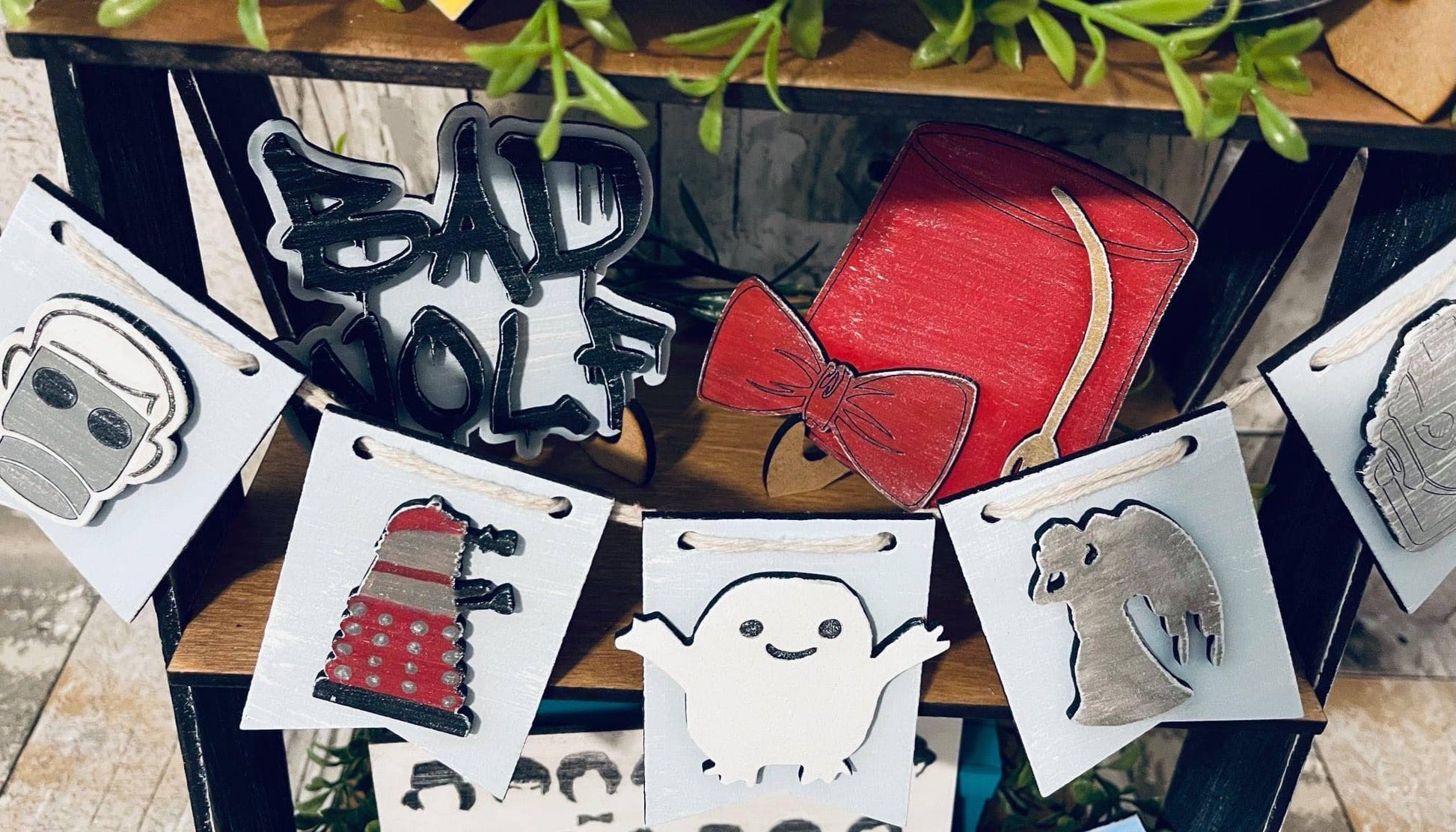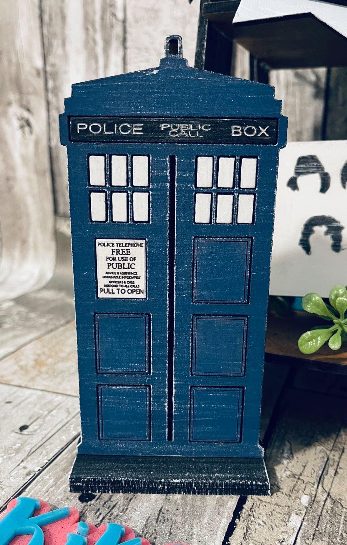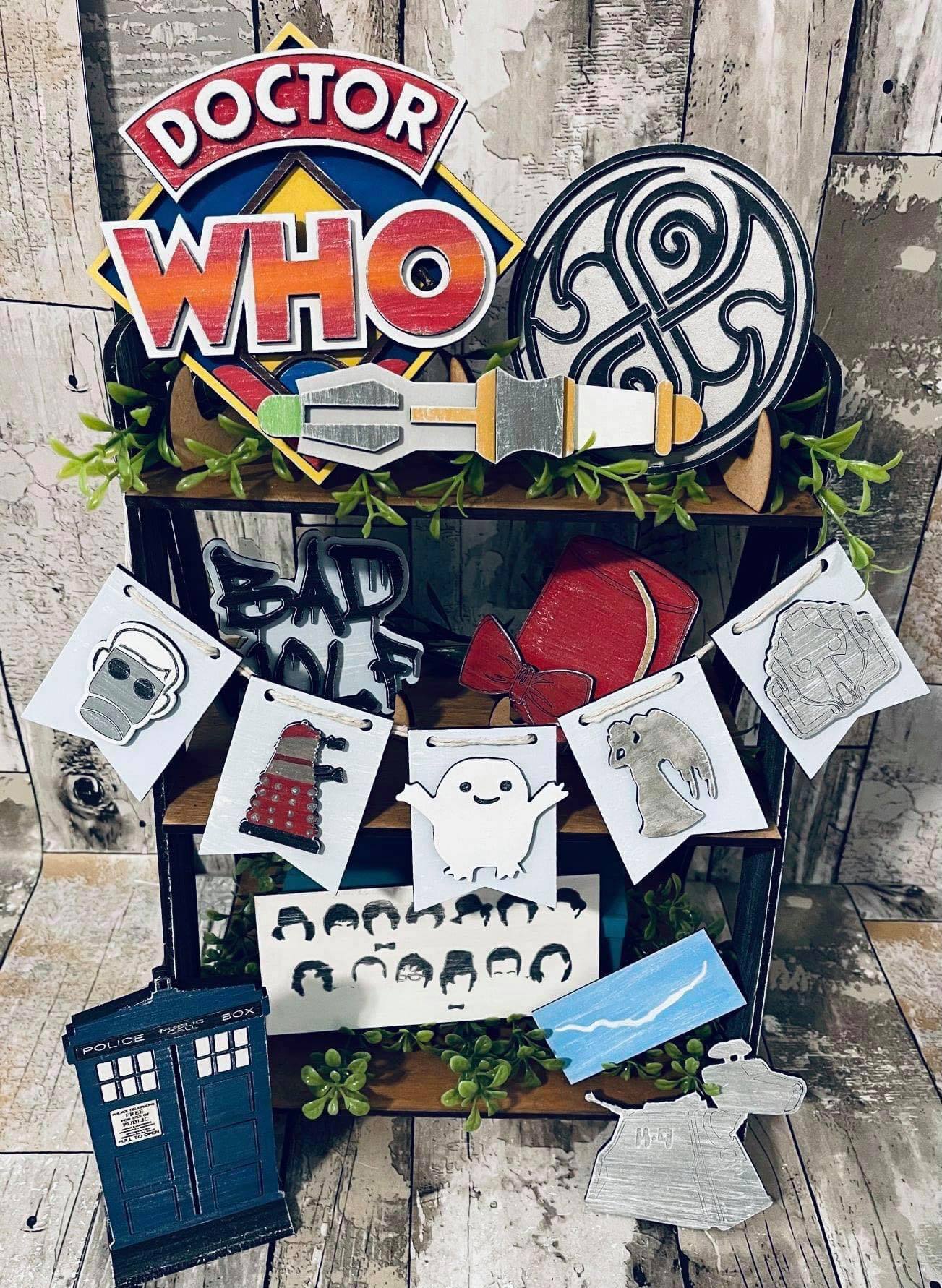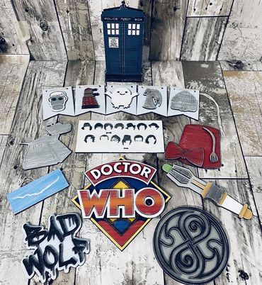 The 3D Doctor Who Tiered Tray set includes 10 pieces (A Flying phone box, a sonic screwdriver, the crack in Amy's wall, time lords seal, fez, bad wolf,banner, k9, doctor silhouettes)