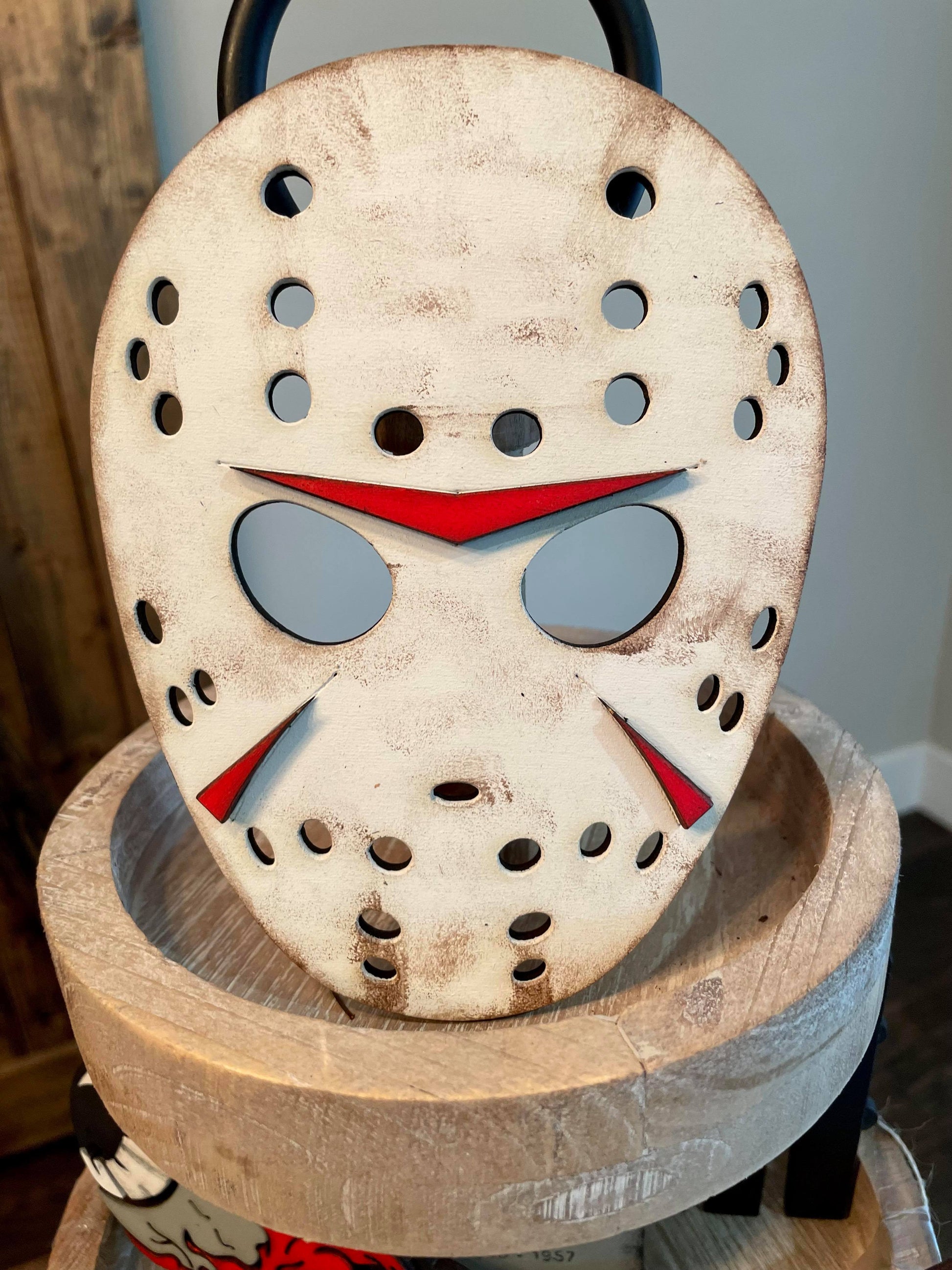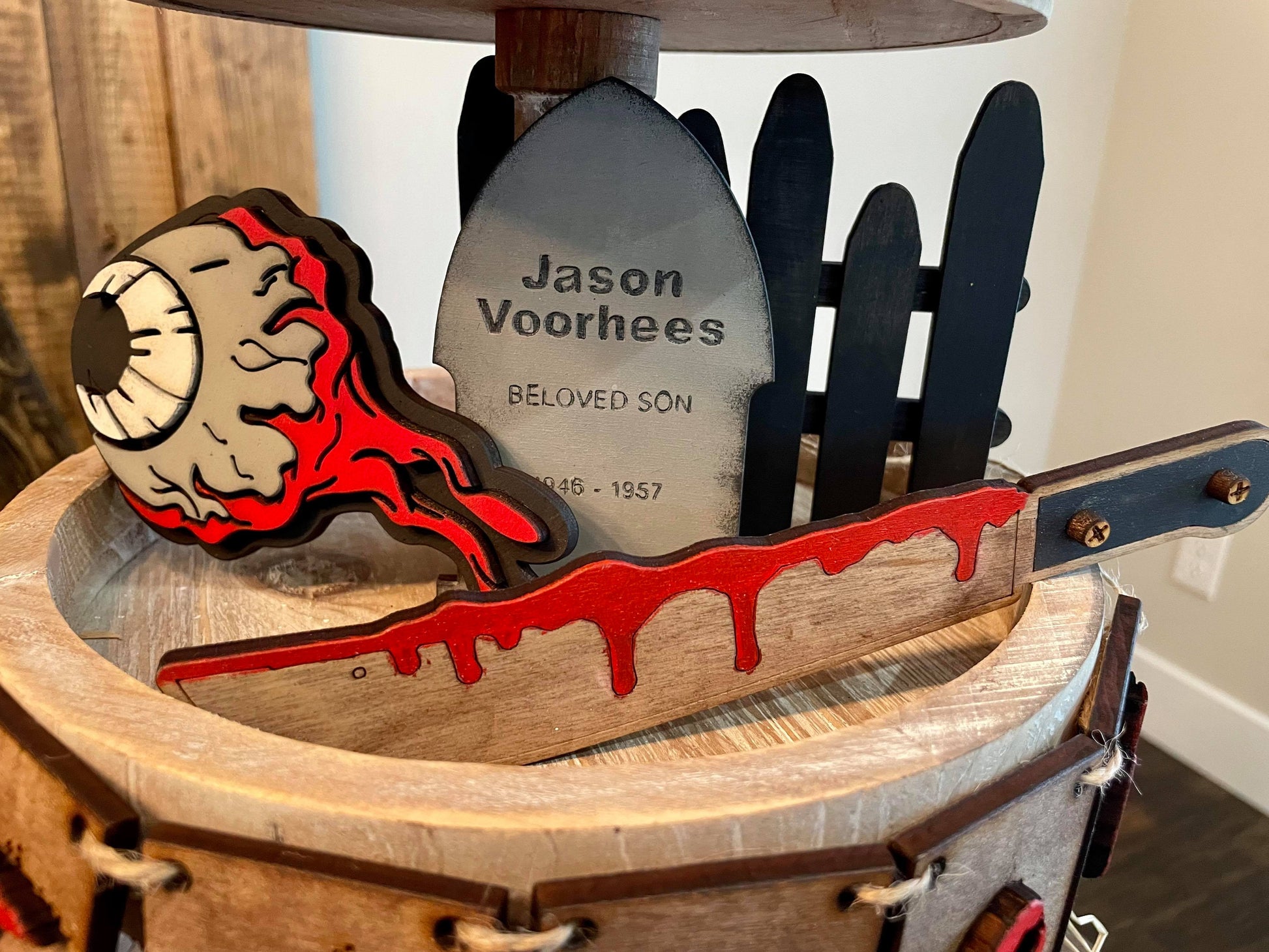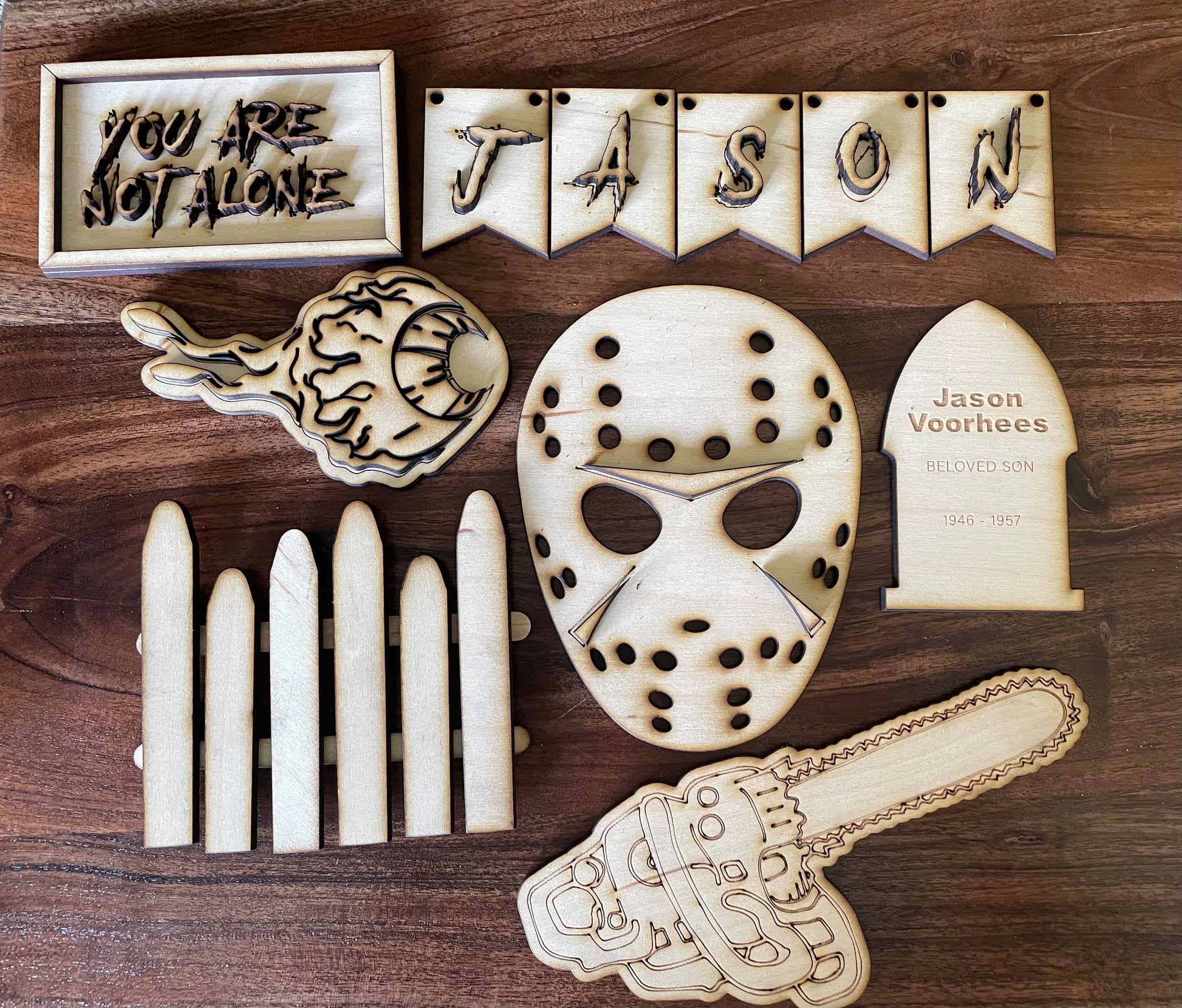 The 3D Jason Tiered Tray set includes 8 blank pieces (Knife, Chainsaw, Jason banner, Jason mask, fence, Jason tomb, you are not alone sign, and an eye)