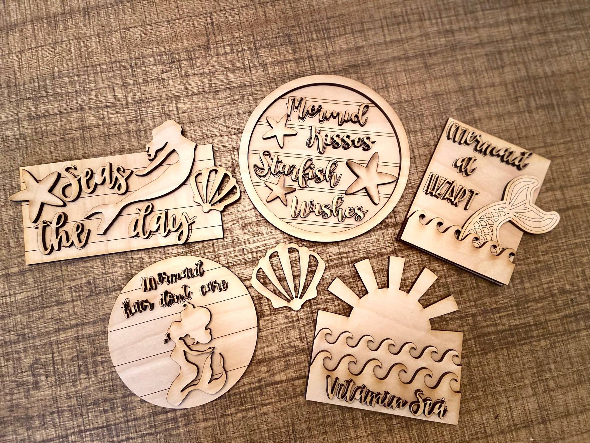 The 3D Mermaid Tiered Tray includes 5 pieces (Seas the day sign, Mermaid kisses starfish wishes sign, mermaid at heart sign, Vitamin Sea sign, shell and mermaid hair dont care sign ) Glitter available at workshops only