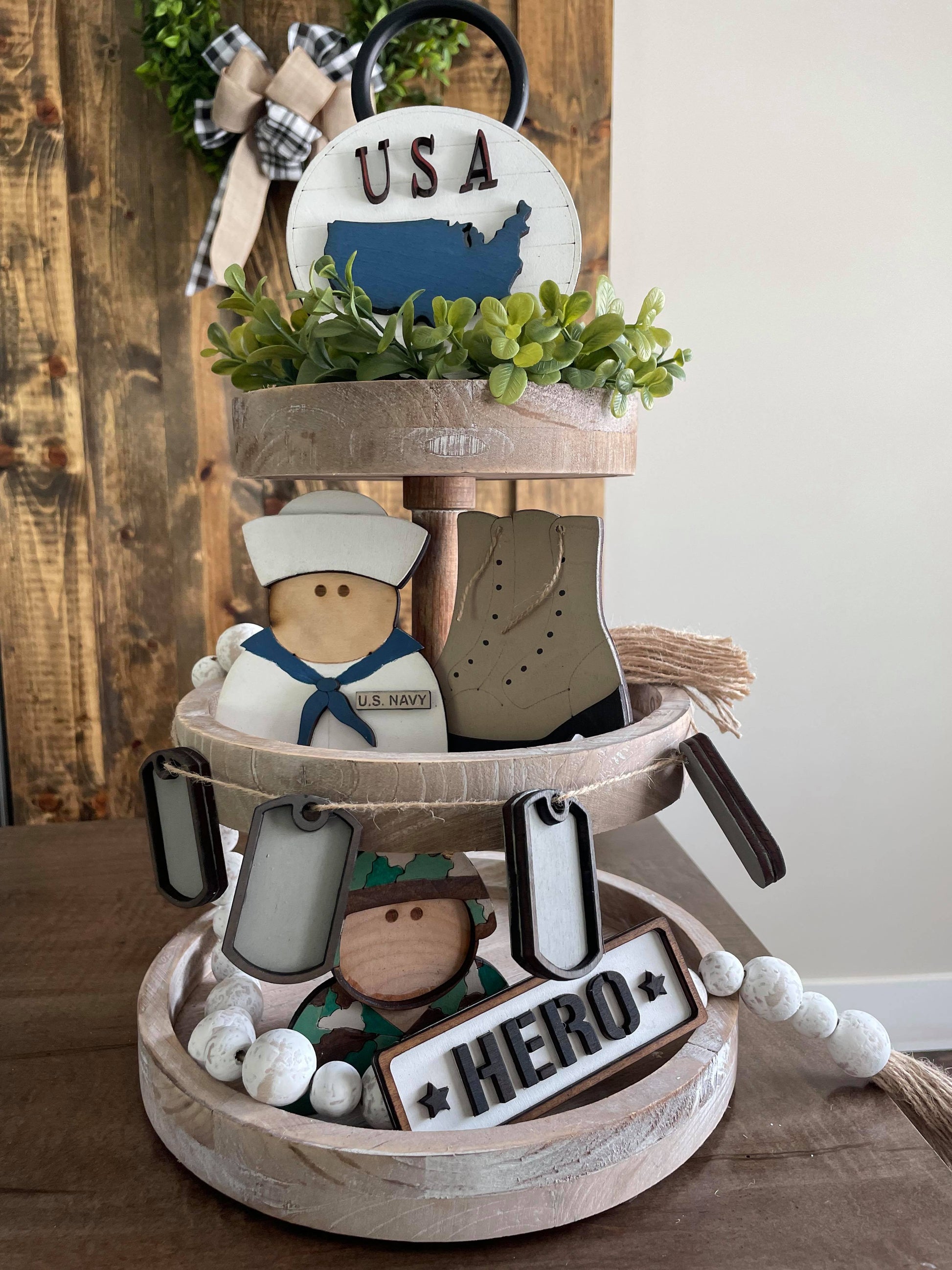 The 3D Military Tiered Tray includes 5 pieces (Military tag banner, military boots, USA round, Hero tag and Military figure (your choice of Branch).)